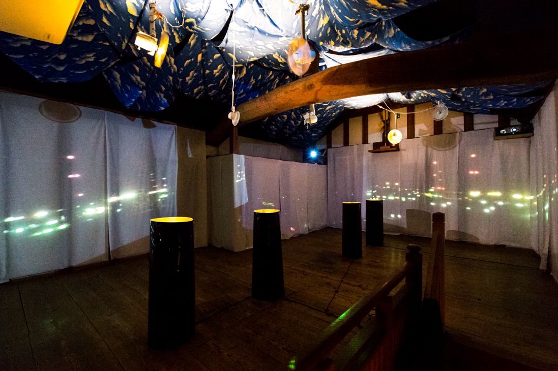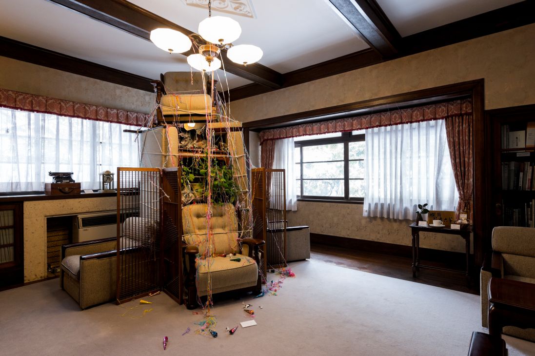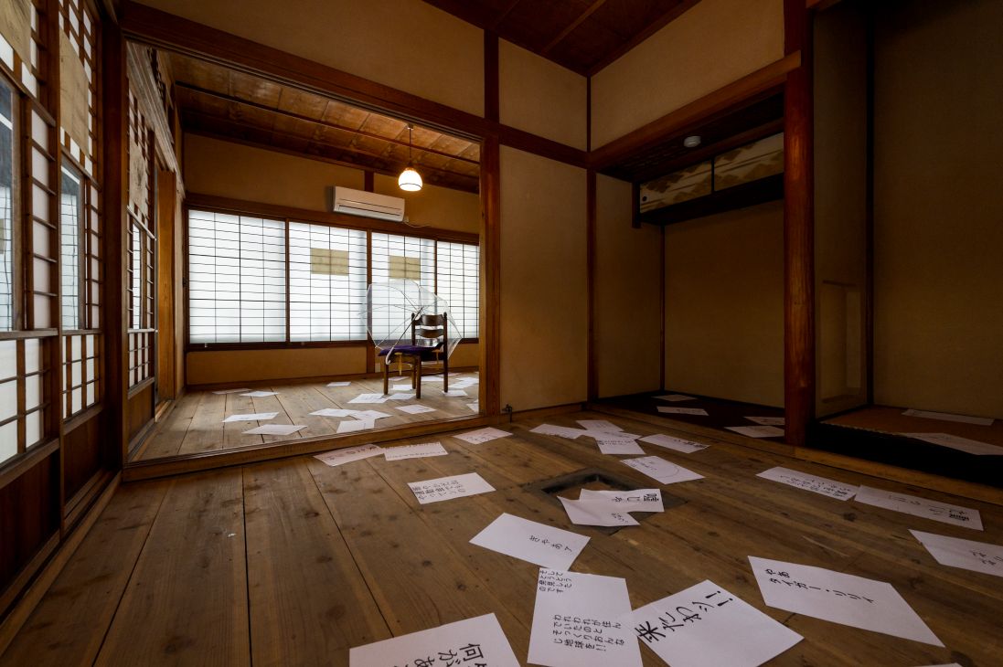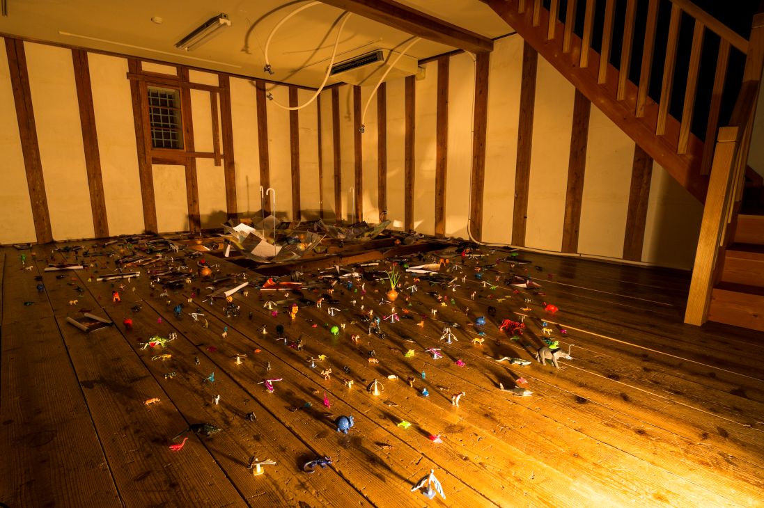 The exhibition was composed of an installation in which visitors walked around the rooms of the Sakyukan, viewing ready-made objects, sounds, languages and phrases used in human interaction, materials that make up infrastructure, representation of imaginary creatures, and the structure of architecture as an environment.