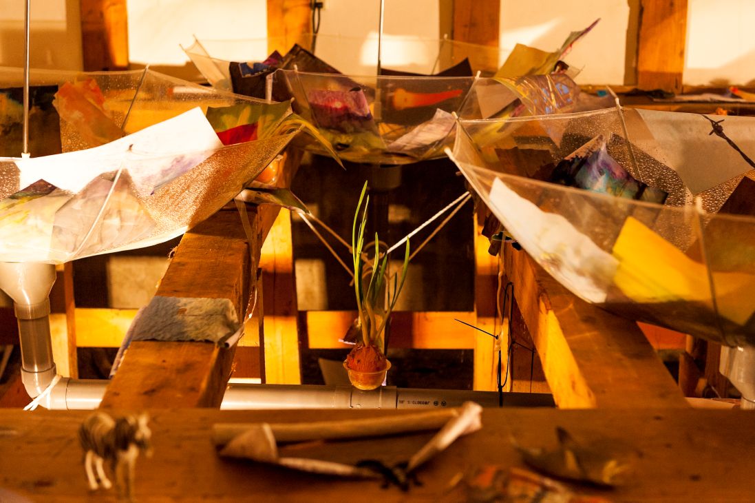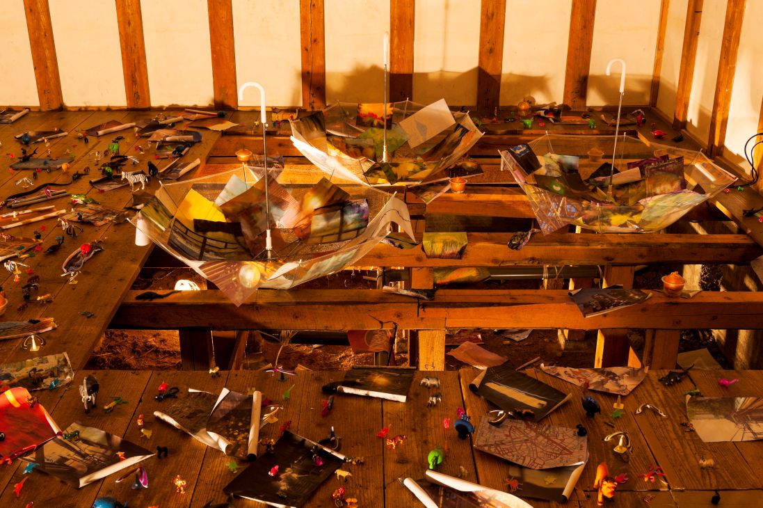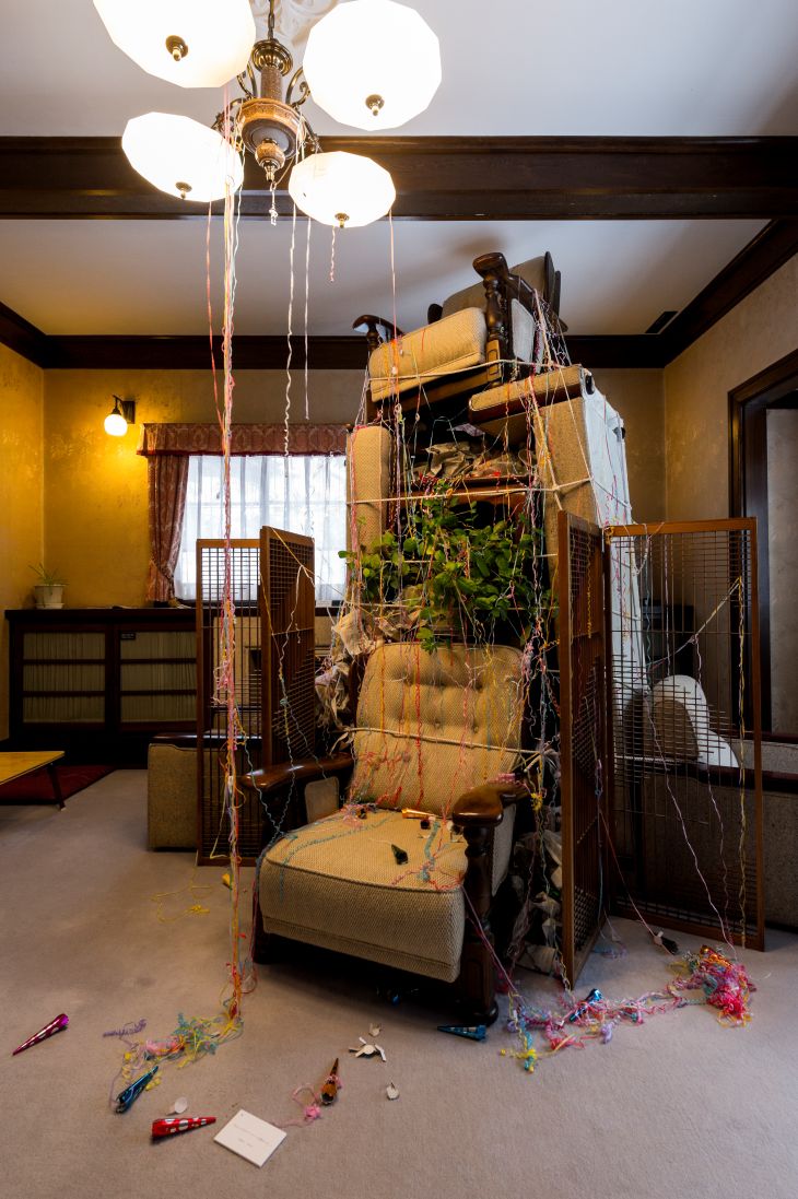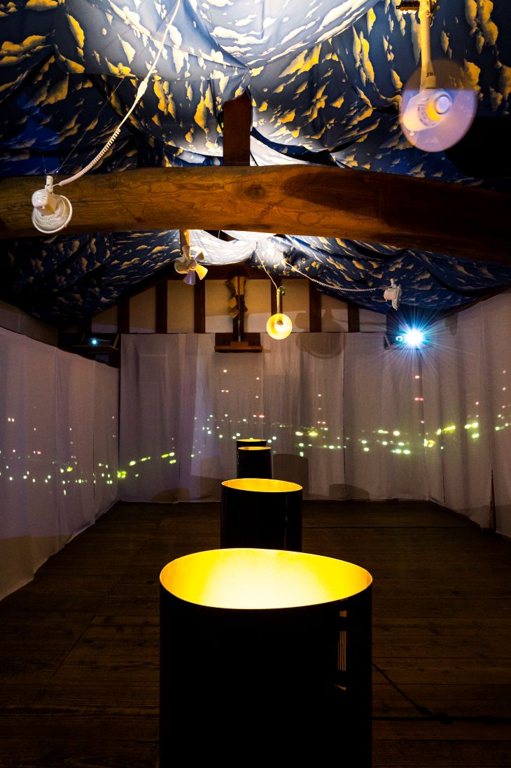 The exhibition was composed of an installation in which visitors walked around the rooms of the Sakyukan, viewing ready-made objects, sounds, languages and phrases used in human interaction, materials that make up infrastructure, representation of imaginary creatures, and the structure of architecture as an environment.
